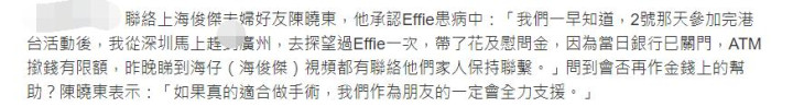 之后,港媒又联络了俊杰夫妇在上海的好友陈晓东,他承认Effie患病中,陈晓东表示:“我们一早知道,2号那天参加完港台活动后,我从深圳马上赶到广州,去探望过Effie一次,带了花及慰问金,因为当日银行已关门,ATM提钱又有限额,昨晚看到海仔(海俊杰)视频都有联络他们家人保持联系。”