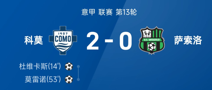 易边再战,科莫继续扩大比分优势。第53分钟,帕斯中路长传禁区,莫雷诺抢在门将出击前头球破门,科莫2-0。第77分钟,多伊格左路传中,沃尔帕托后点推射空门击中边网,错失缩小差距良机。最终科莫2-0取得2连胜。