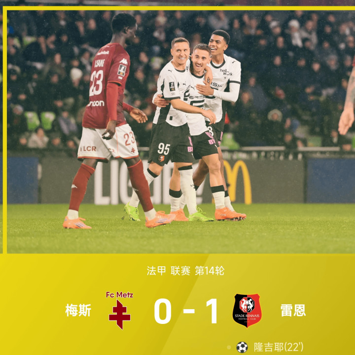 第55分钟,阿索罗越位位置接应队友直塞推射破门被判无效,无缘为主队扳平。此后双方都无力攻破对方球门,最终雷恩1-0战胜梅斯,取得四连胜。