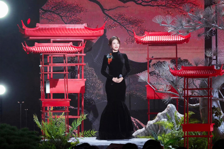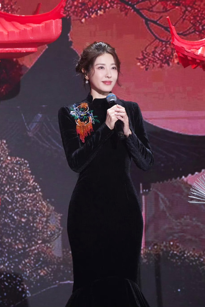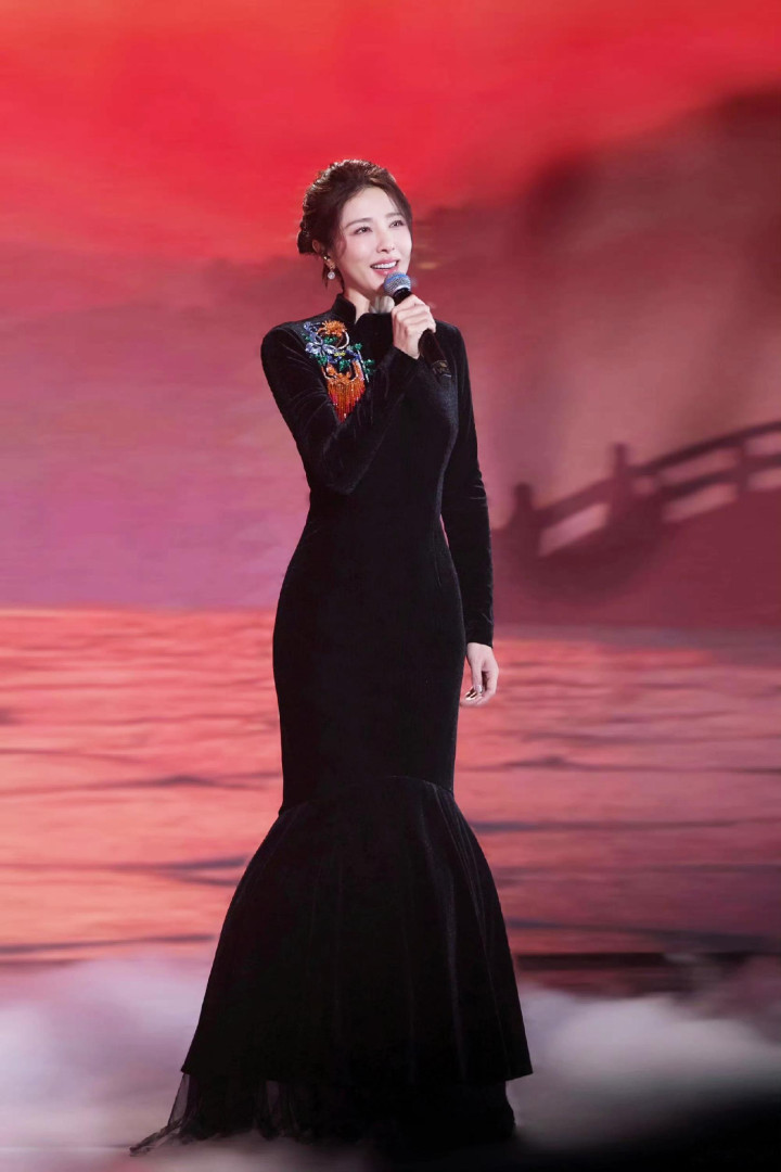 舞台红光映衬下,她手持话筒,眼神沉静又自带力量,成熟女性的妩媚与端庄在此刻交织,展现出黑色丝绒的华贵与自身的骨相美,尽显“岁月不败美人”的强大气场。