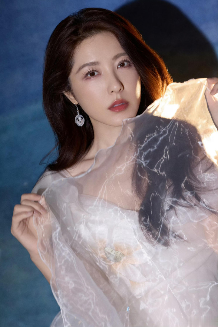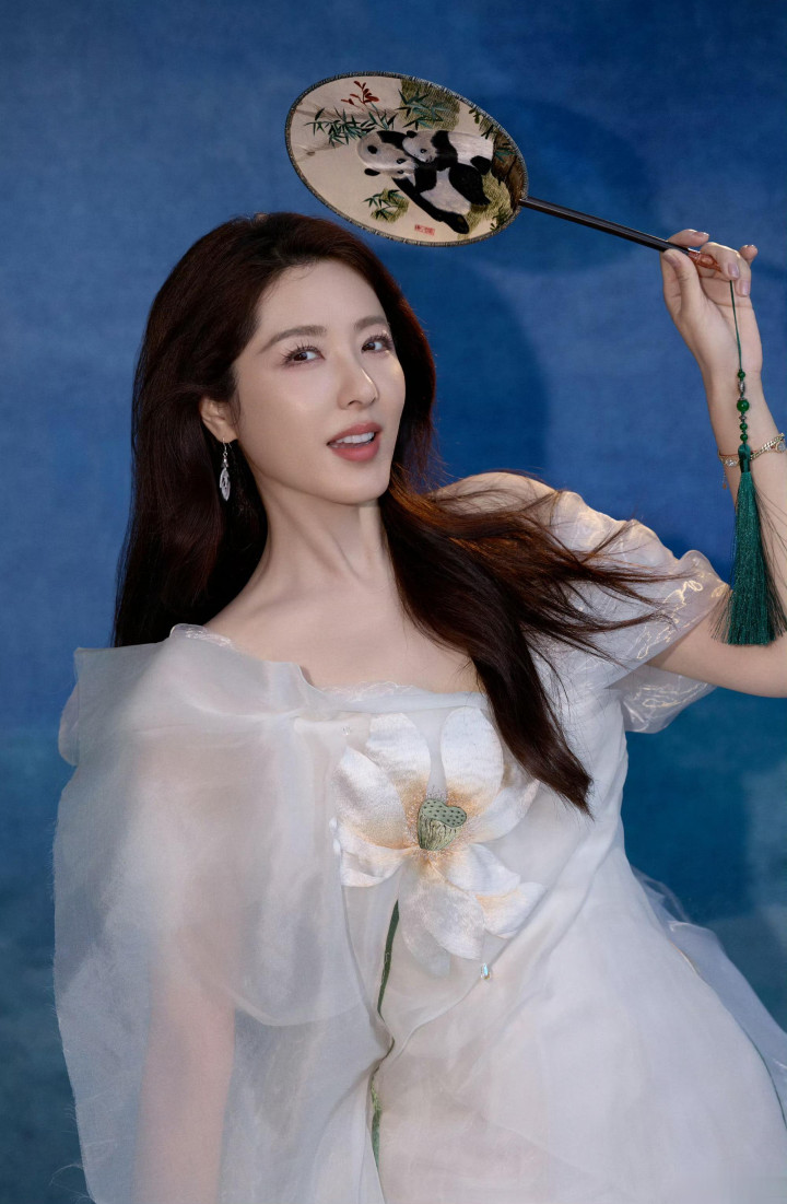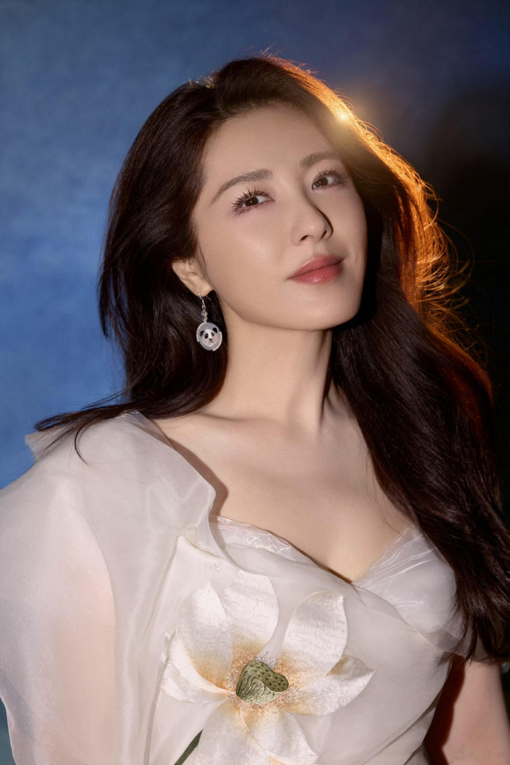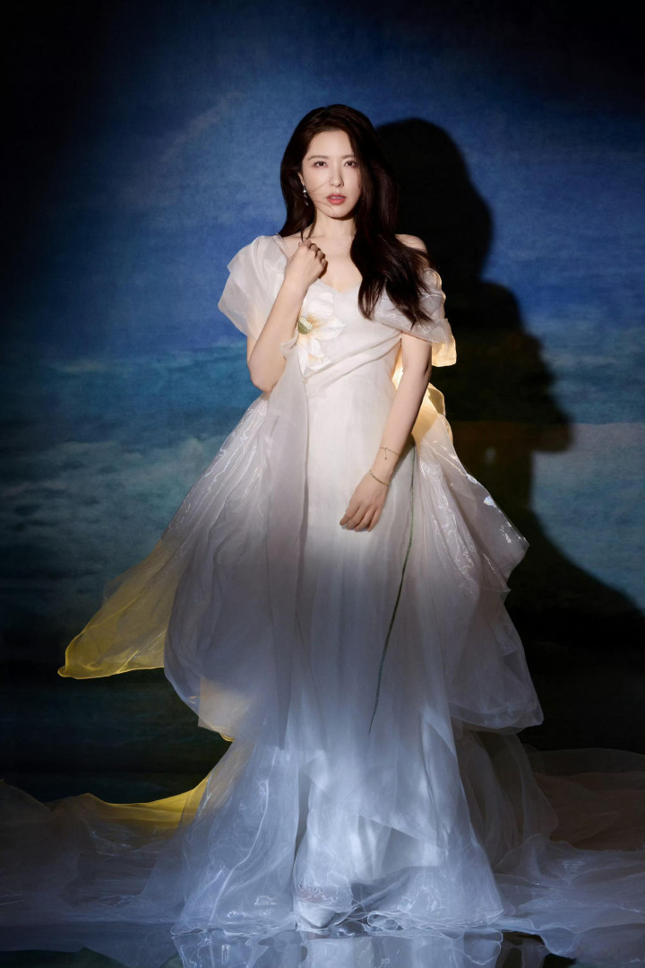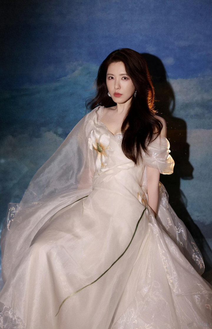 曾黎白色纱裙造型,堪称东方古典韵味的极致诠释。轻纱如雾般轻盈垂落,肩头的立体花卉刺绣细腻雅致,将她的温婉与灵动完美融合。