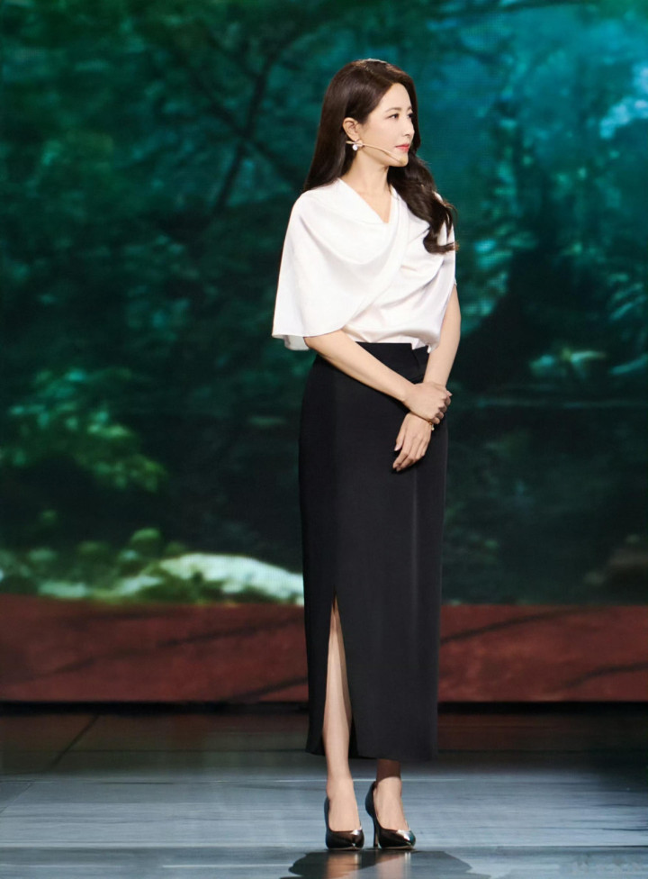 换上黑白简约造型,知性大女主气质溢于言表。白色垂领上衣的立体褶皱设计简约却不单调,搭配高腰黑色半裙,利落线条与柔美的身形完美融合,衬得身姿愈发挺拔。