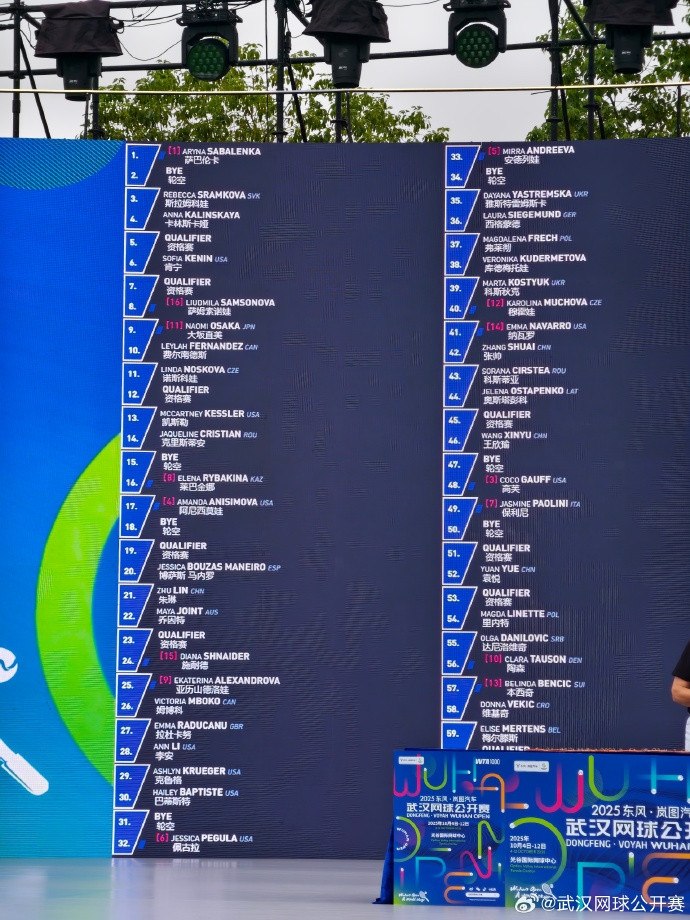 新华社武汉10月4日电(记者肖亚卓、乐文婉)2025年武汉网球公开赛单打正赛签表4日正式揭晓,世界排名前两位的萨巴伦卡和斯维亚特克分列上下半区,中国“金花”朱琳、王欣瑜、袁悦和张帅将直接参加正赛。