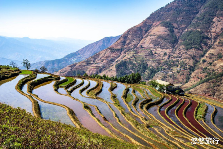 明净的天空下,层层叠叠的傈僳梯田美不胜收,顺着游步栈道,可以俯瞰梯田全景。