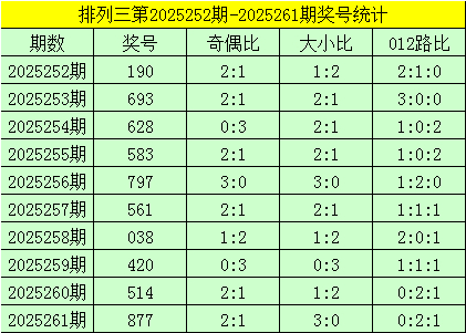 开奖回顾:排列三第2025261期奖号为:877,其奇偶比为2:1,大小比为3:0,奖号012路比为0:2:1。