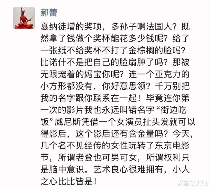接着郝蕾开始无差别扫射,先骂戛纳拿奖的《狂野时代》和导演毕赣,再骂威尼斯拿最佳女演员奖的《日掛中天》和辛芷蕾,最后带上了东京电影节上的几位女当事人,多少会给《日掛中天》票房造成负面影响,而白百何这么一闹,《春树》能不能上映都不好说了。